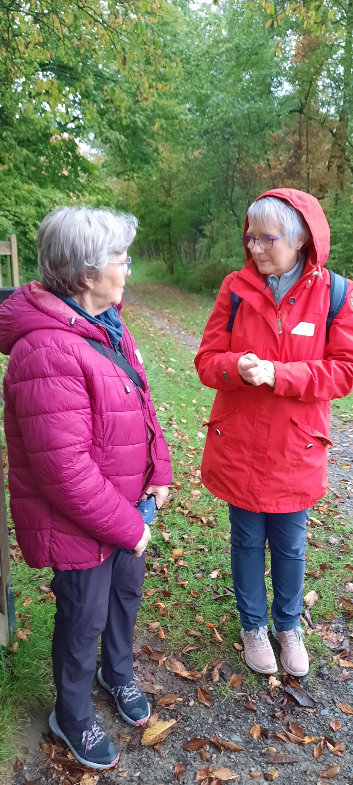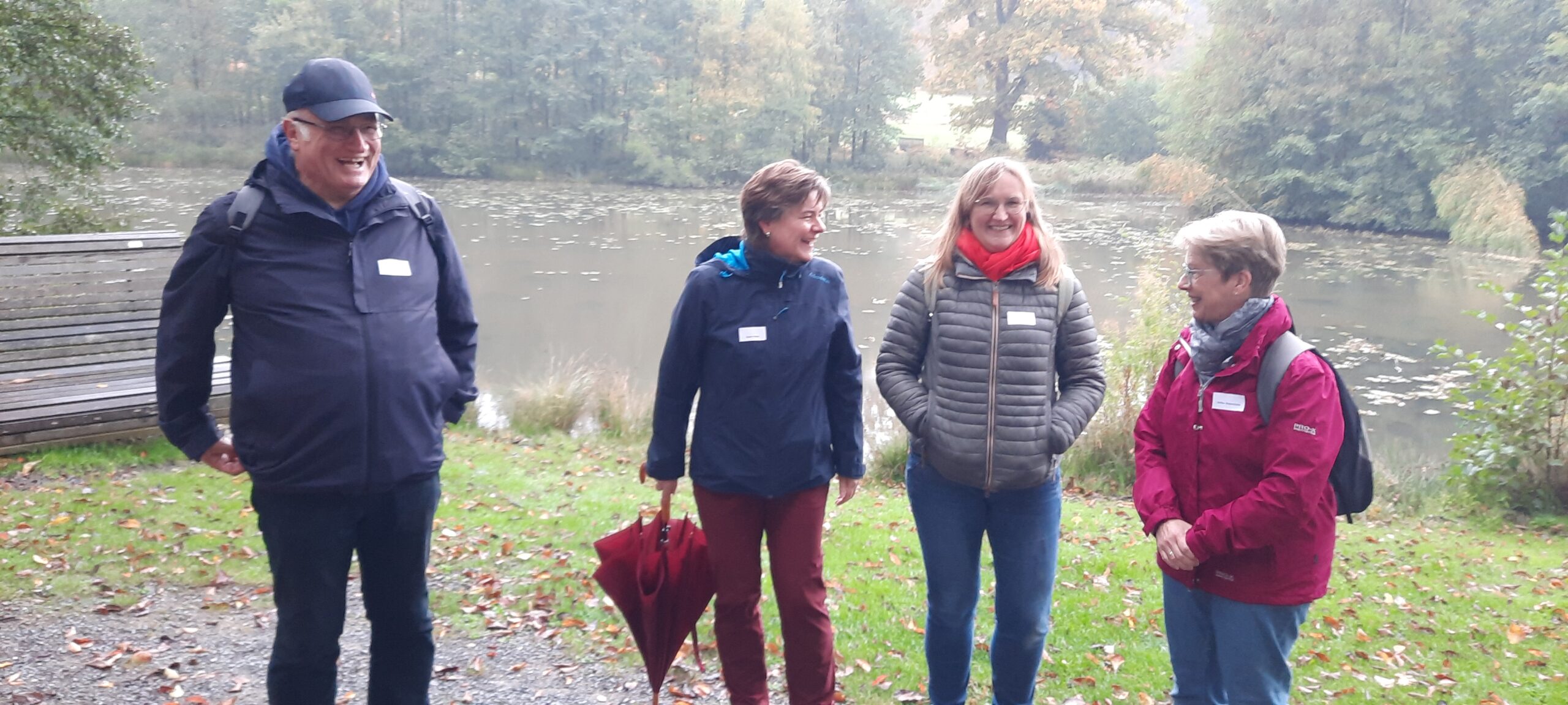 Bei grauem Nieselwetter ging es zu den verschiedenen Stationen im Wald; immer begleitet von zum Landschaftsbild passenden Texten und Impulsen zum Gespräch. So verbarg sich ein zugewucherter Weg hinter dem Schild „Gang ins Ungewisse“ – dahinter wiederum, lag der „Zukunftswald“. Vielleicht auch ein Bild für die Situation der Kirche? – Wohin geht die Entwicklung der Kirche? Hier tauschten sich die Teilnehmenden über ihre Gefühle und Ideen mit Blick auf die Zukunft der Kirche aus, auch über Chancen und Befürchtungen im Rahmen den Bistumstransformation. Oben auf dem Kammweg mit der Aussicht auf die Weite des Sauerlandes ging es um neue Perspektiven, die Sie in der vergangenen Amtszeit gewonnen hatten. An einer beeindruckenden Baumwurzel waren die Wurzeln und Kraftquellen des eigenen Glaubens Thema.